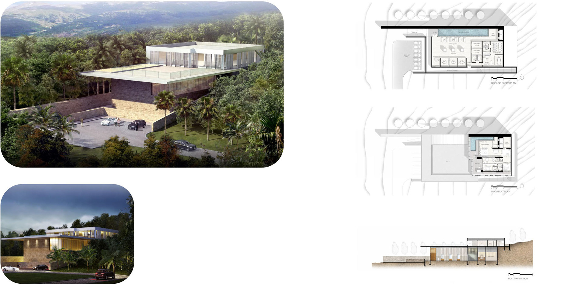 Two versions of show flats were designed for Three Sixty West Tower of the Worli Mixed-Use project. In both versions the sales gallery is located at the bottom and the show flat at the top. In the first scheme the sales gallery volume reads as a separate pavilion with the show flat volume at the top. In the second scheme the sales gallery and show flat volumes are integrated. Both schemes incorporate the Tower curtain wall system in their facades.